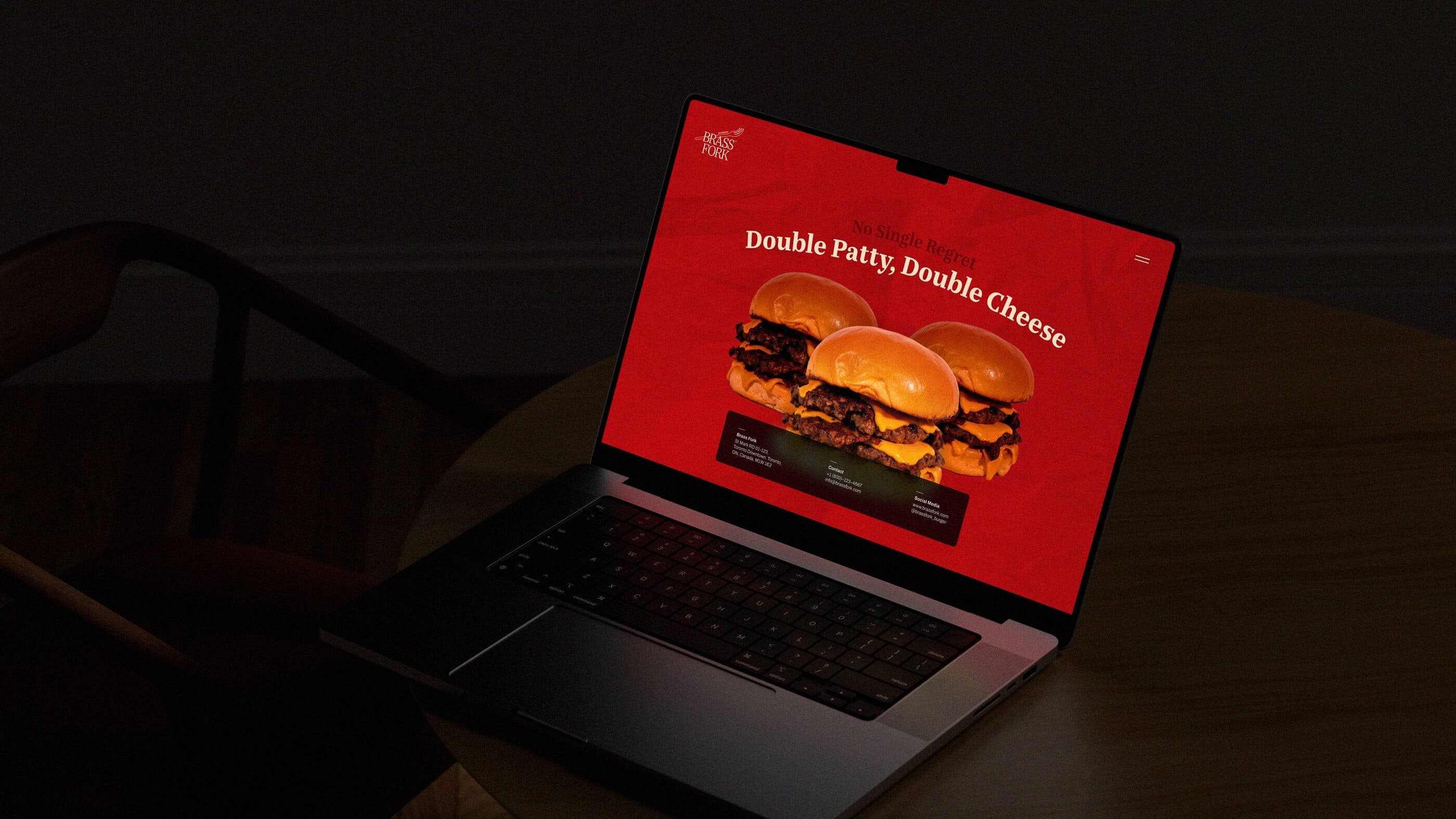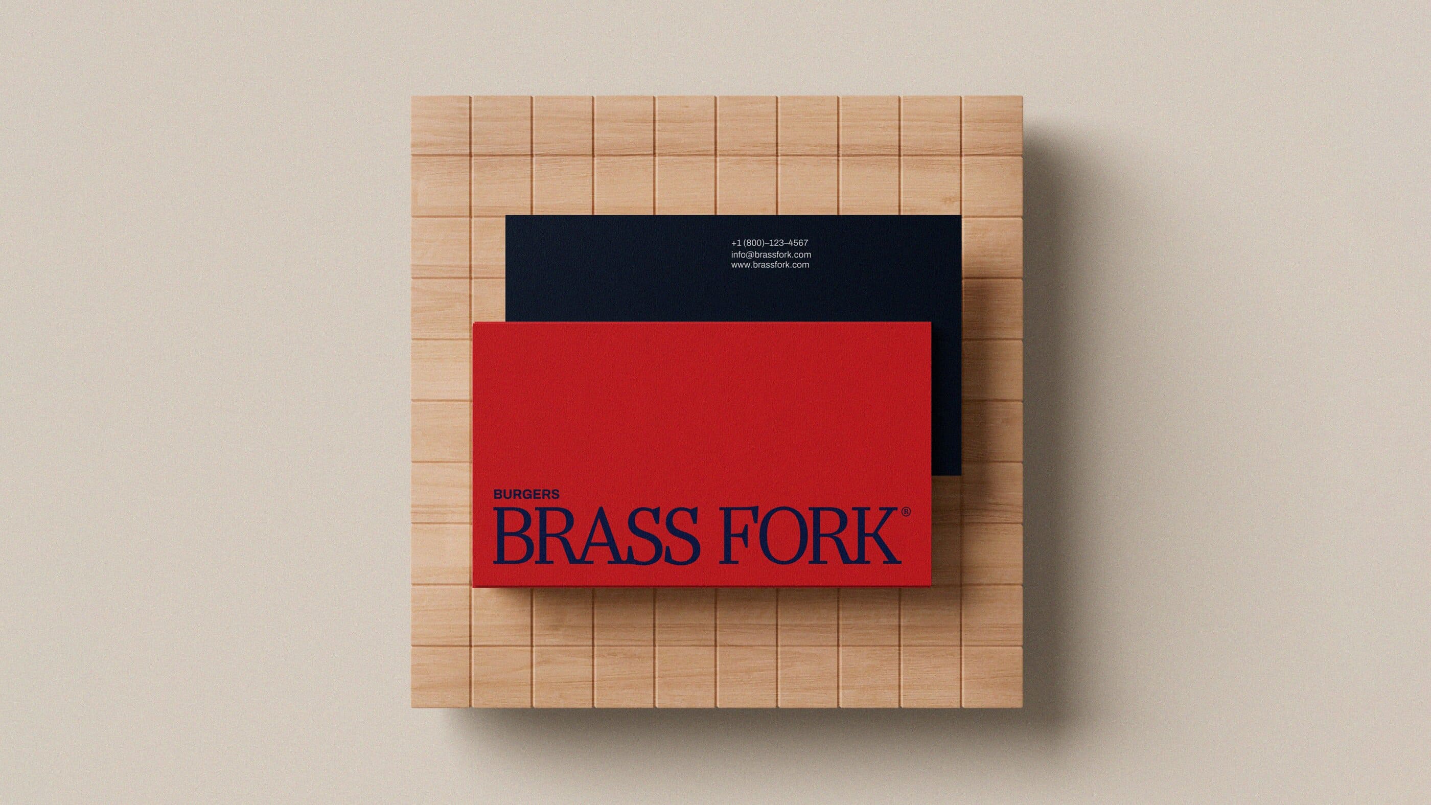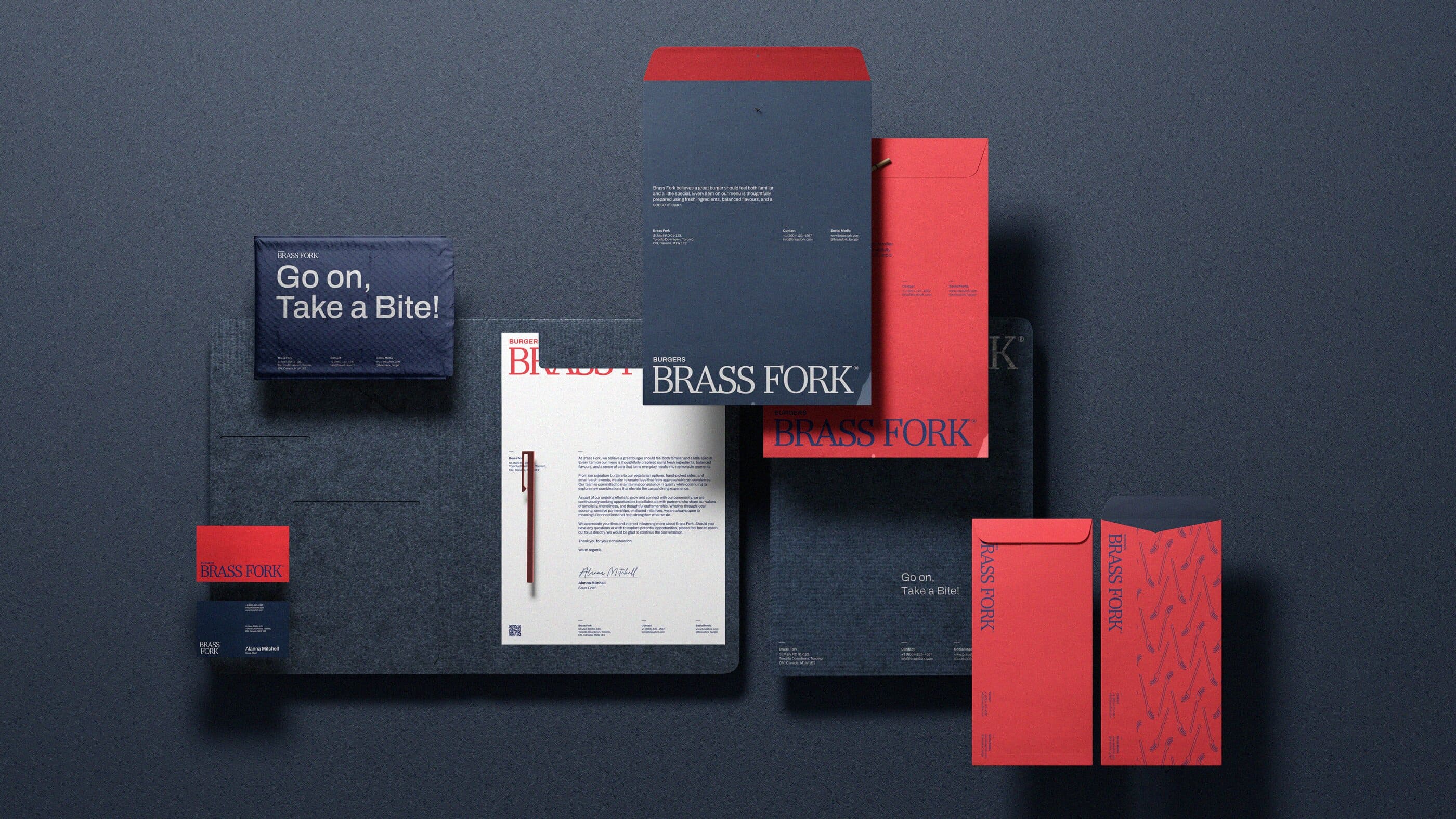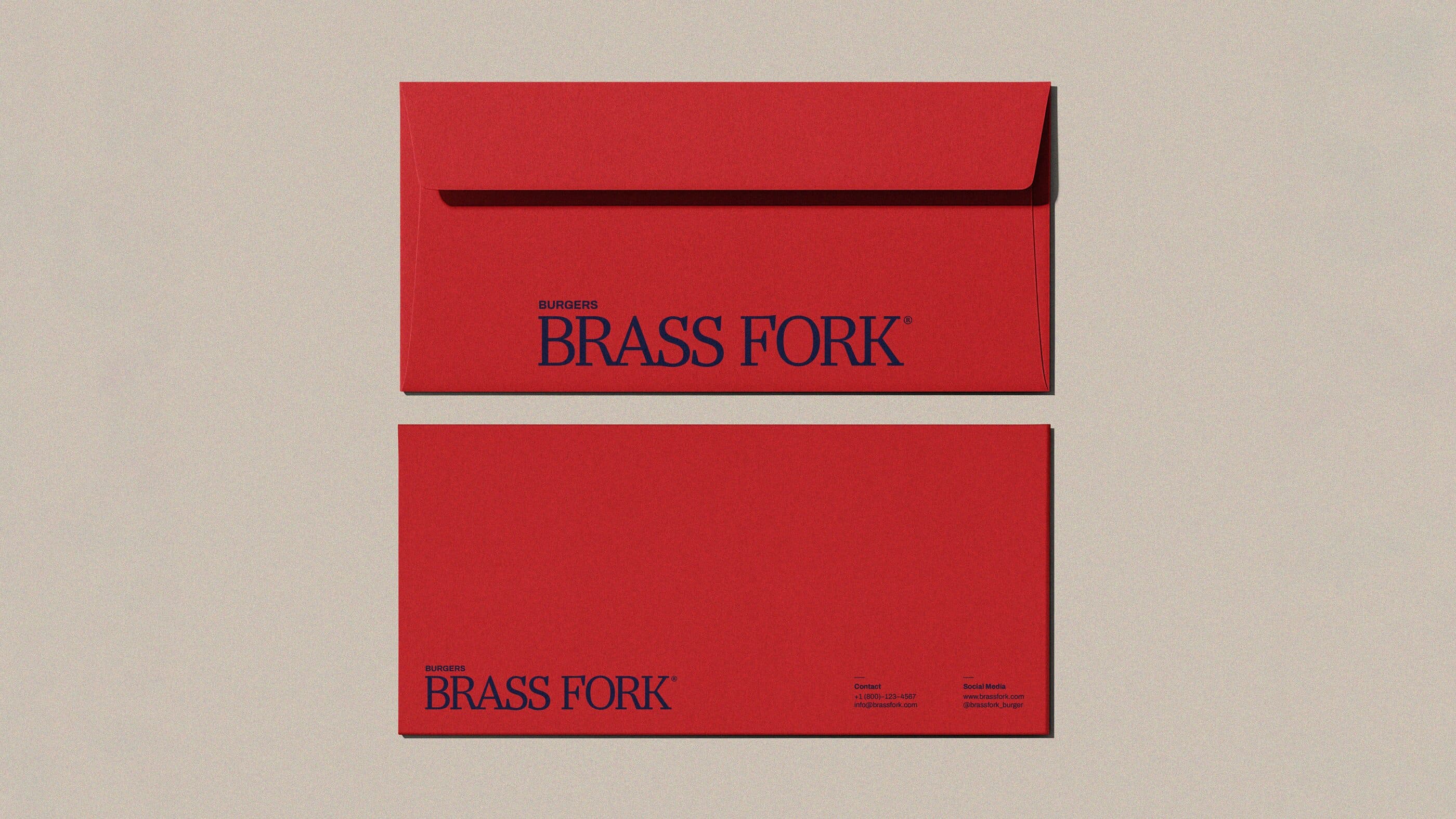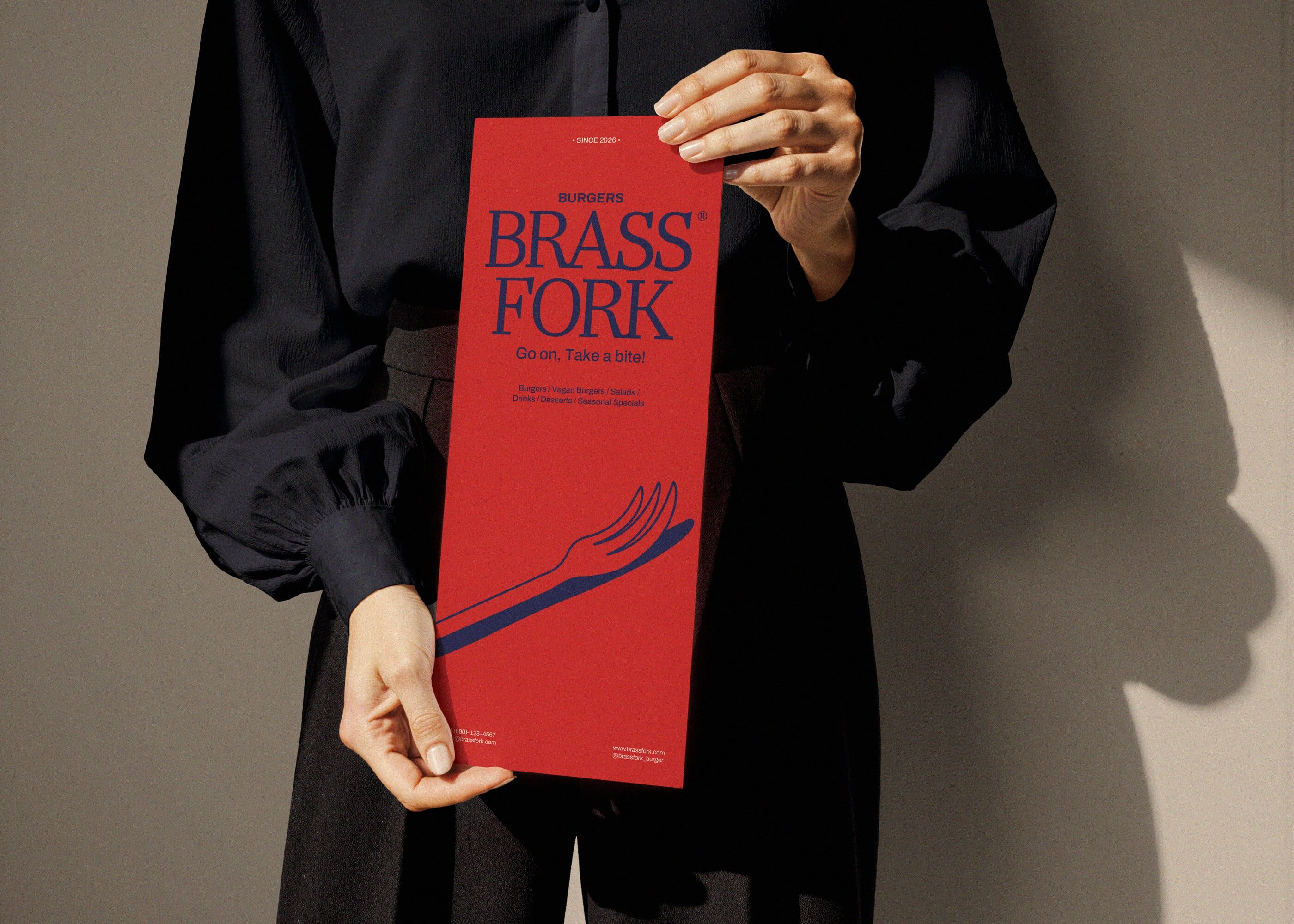 Brass Fork is a burger house that balances a semi-luxurious experience with a classic, casual, and friendly tone of voice. They offer thoughtfully crafted burgers, including homemade and customizable options, within a warm wooden interior. Strong visual contrast that is led by scarlet red and deep navy creates a bold yet refined identity. A small fork illustration adds approachability, ensuring the brand feels welcoming without losing its sense of sophistication.