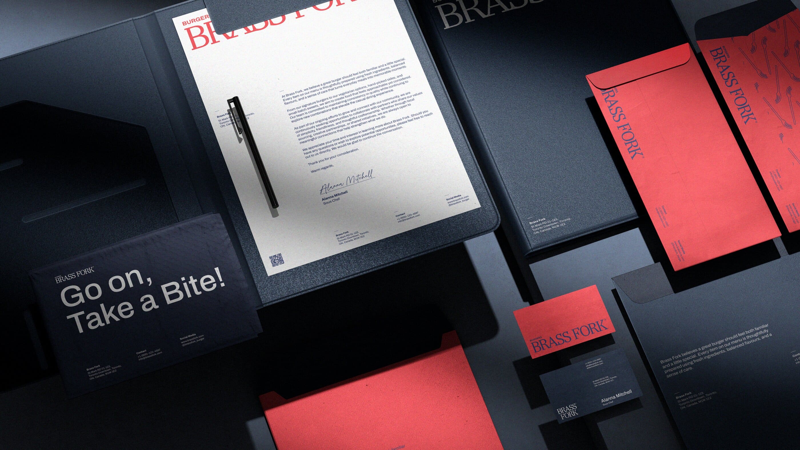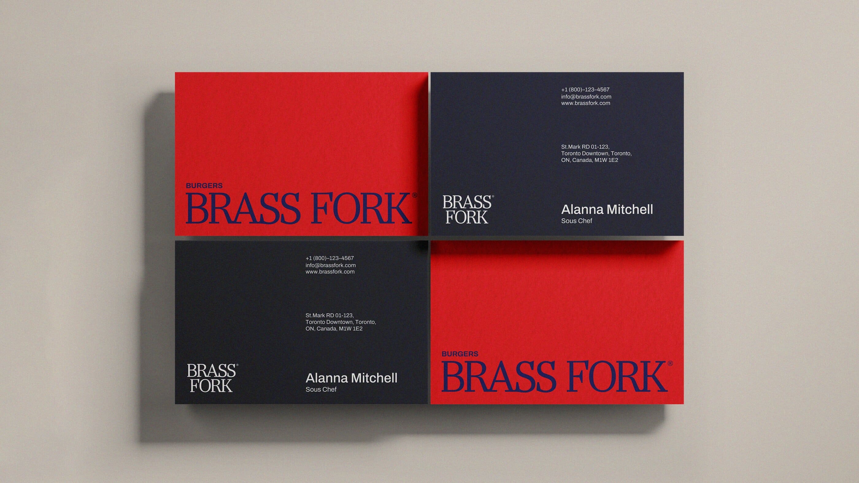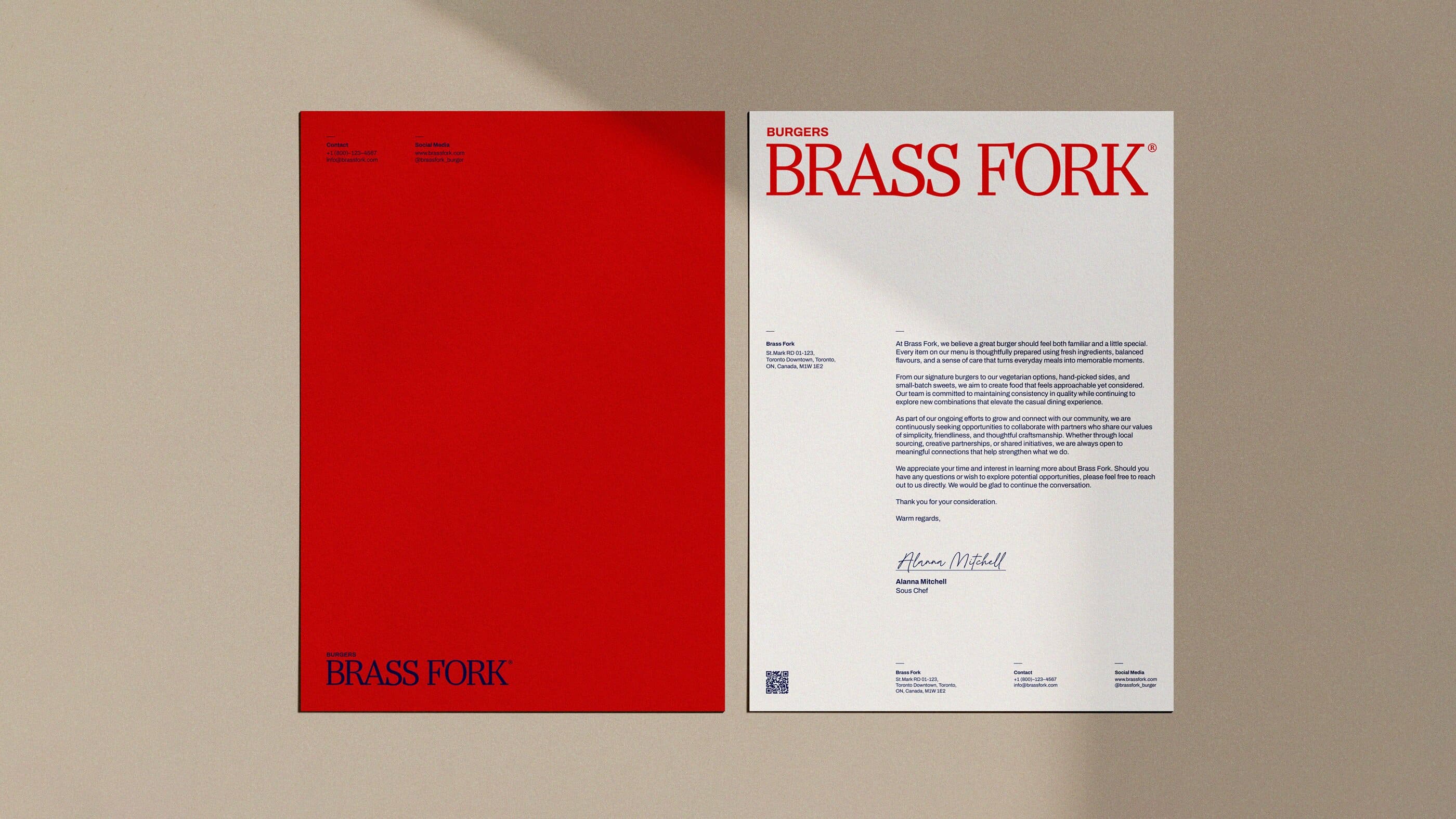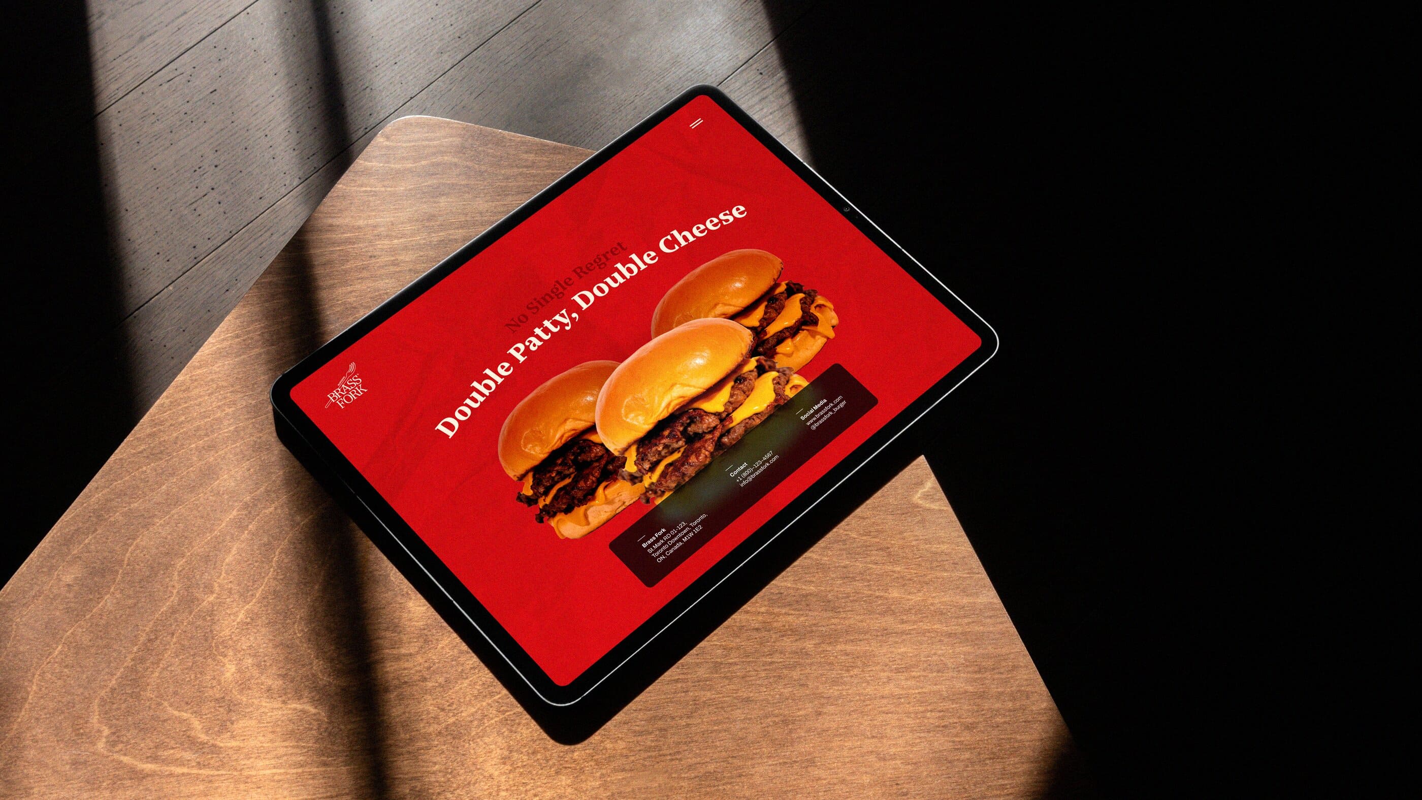 Brass Fork is a burger house that balances a semi-luxurious experience with a classic, casual, and friendly tone of voice. They offer thoughtfully crafted burgers, including homemade and customizable options, within a warm wooden interior. Strong visual contrast that is led by scarlet red and deep navy creates a bold yet refined identity. A small fork illustration adds approachability, ensuring the brand feels welcoming without losing its sense of sophistication.