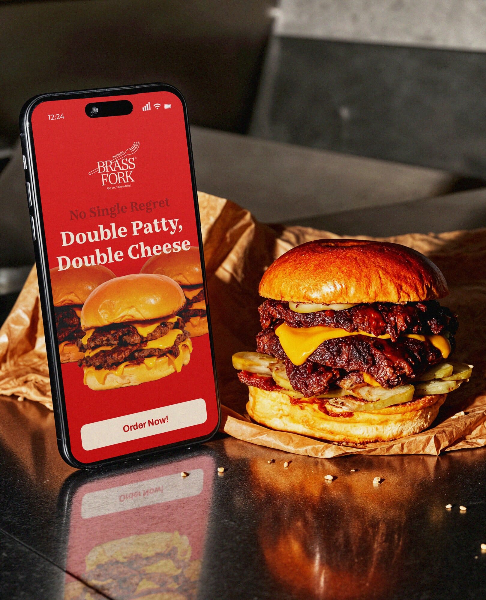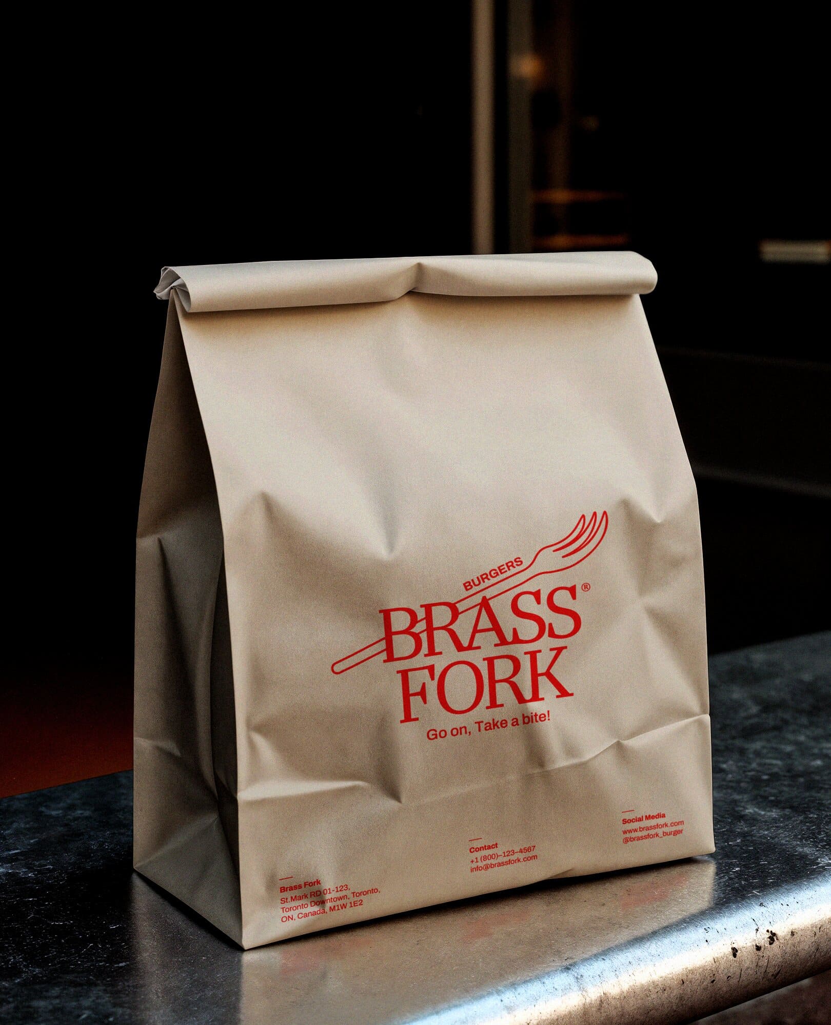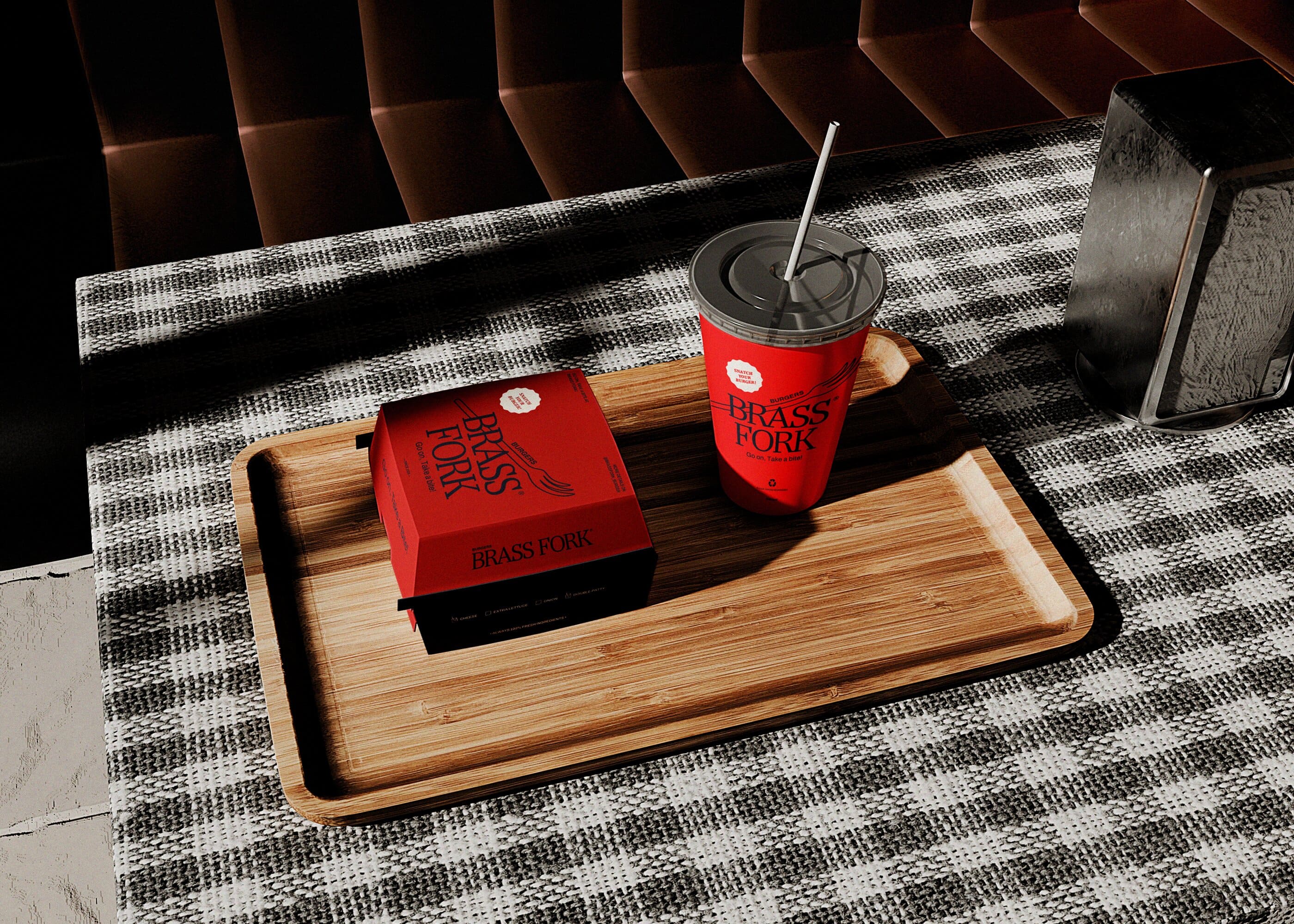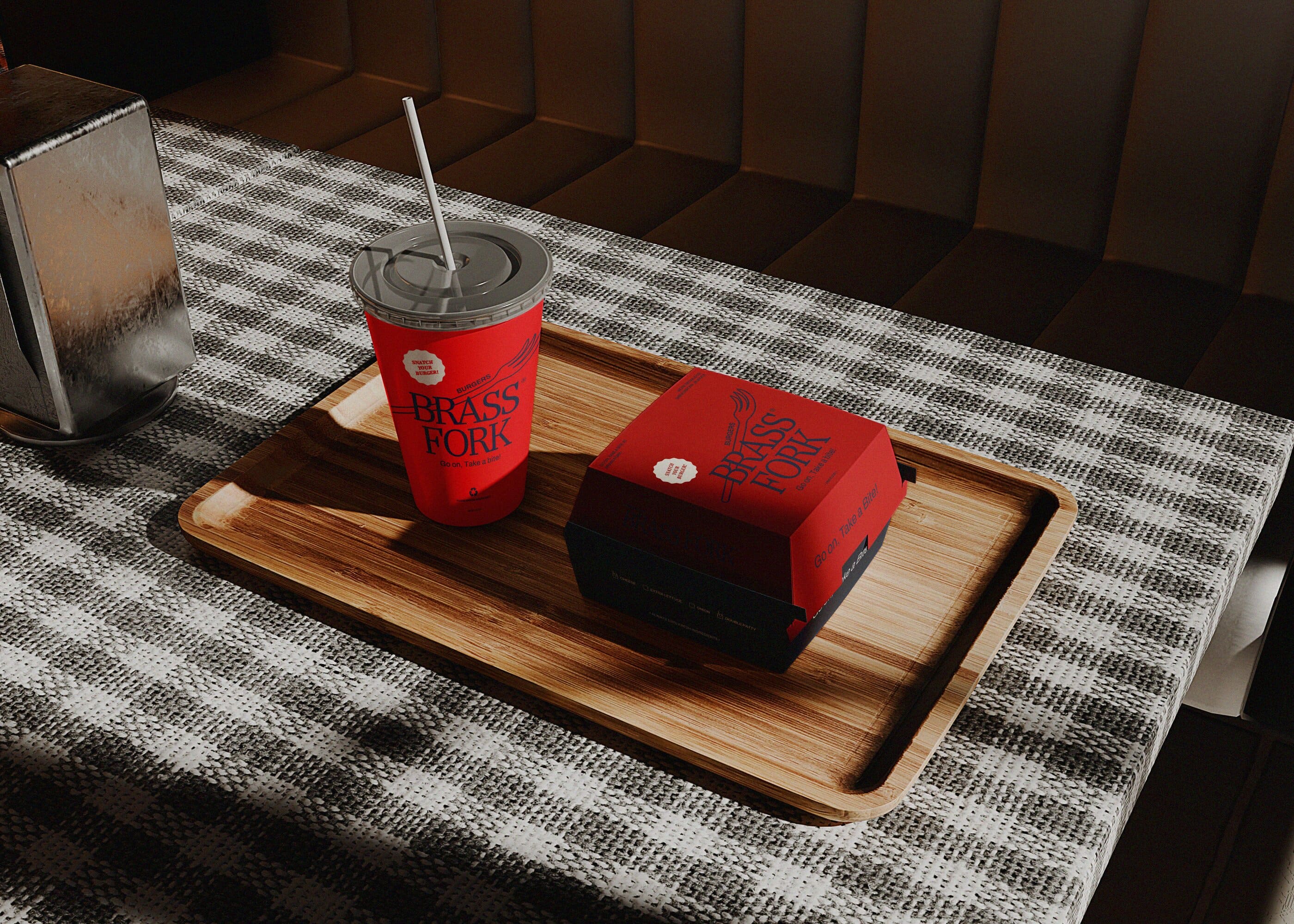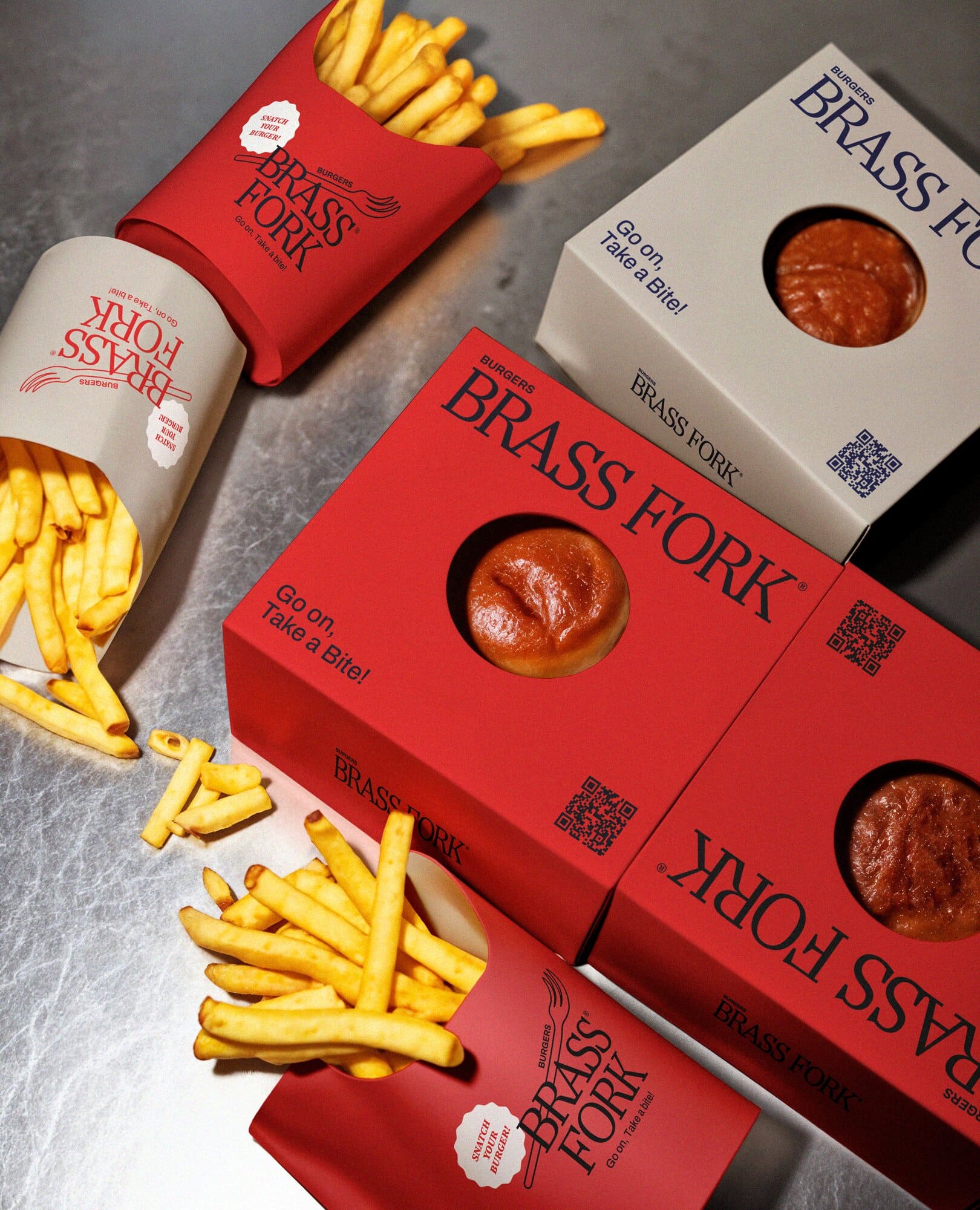 Brass Fork is a burger house that balances a semi-luxurious experience with a classic, casual, and friendly tone of voice. They offer thoughtfully crafted burgers, including homemade and customizable options, within a warm wooden interior. Strong visual contrast that is led by scarlet red and deep navy creates a bold yet refined identity. A small fork illustration adds approachability, ensuring the brand feels welcoming without losing its sense of sophistication.