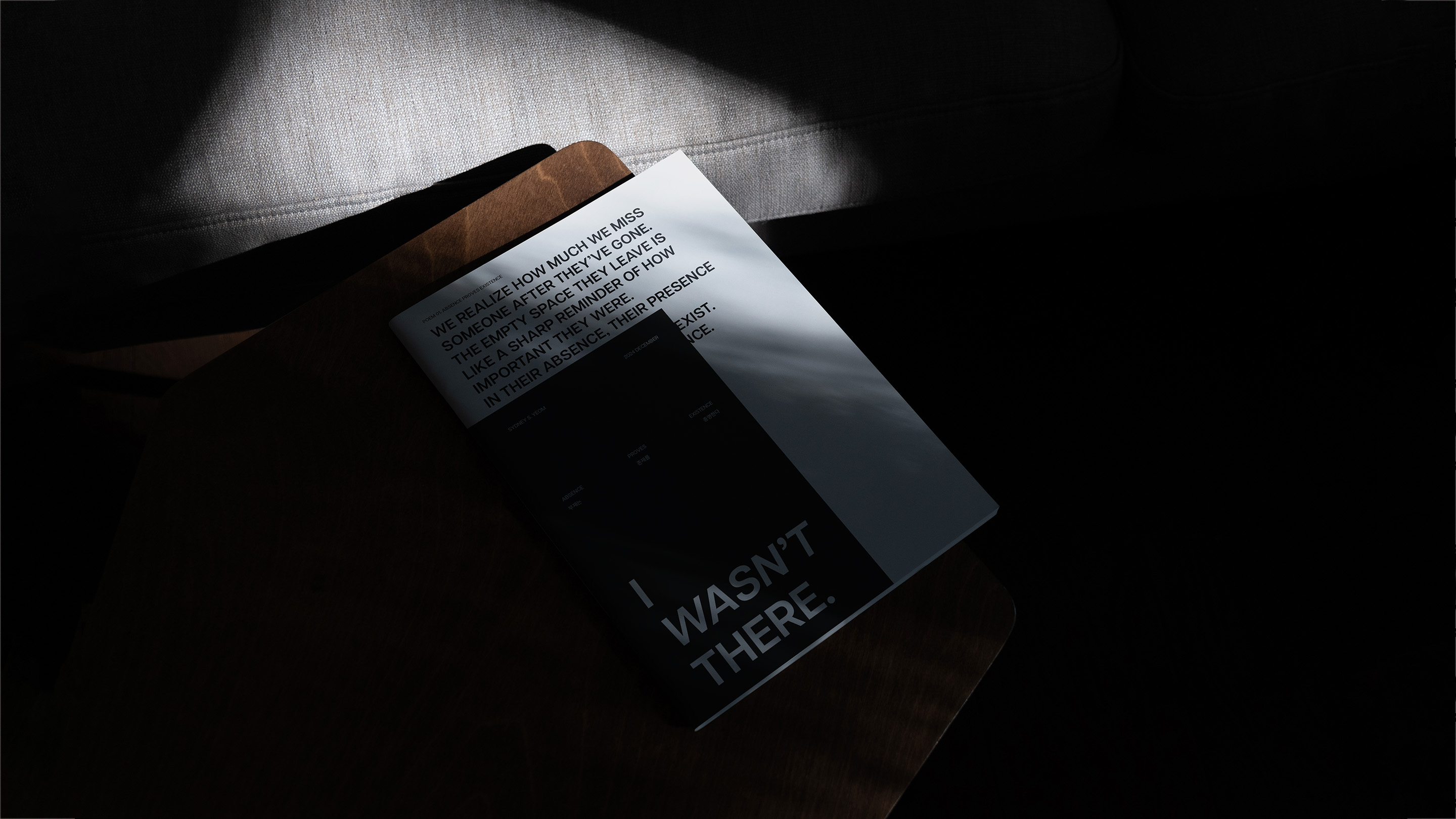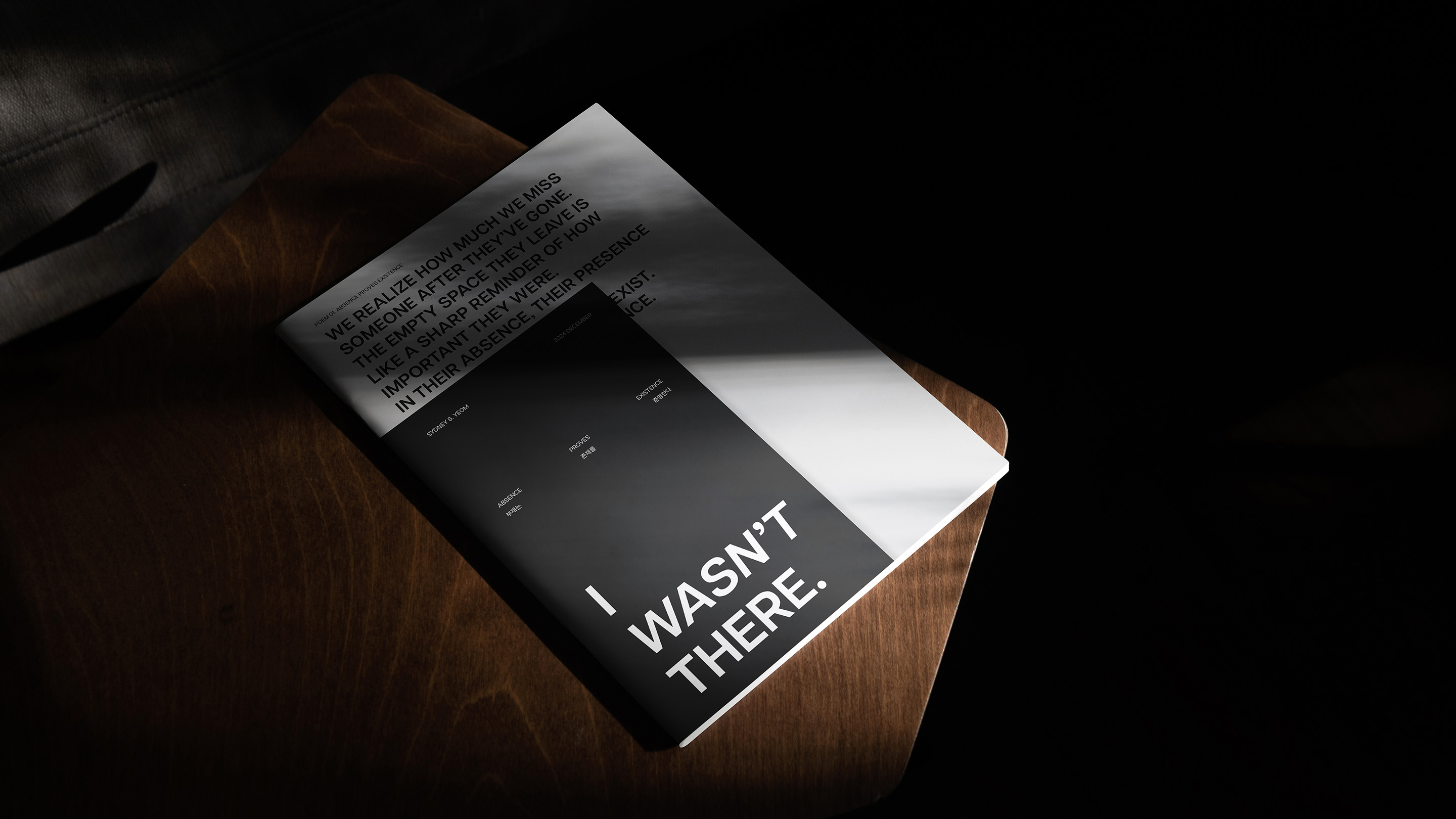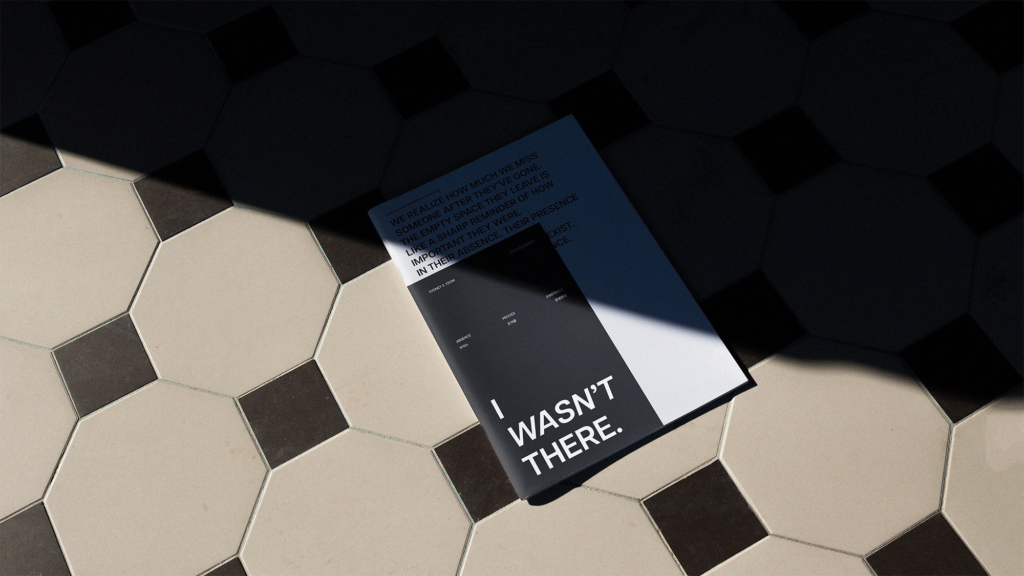 Given the title I Wasn’t There, the primary challenge was to develop content that meaningfully connected to its theme. The project was structured as three interconnected booklets, each contributing to the overarching narrative of the title. While a minimum amount of text was required, the remaining content and pacing were left to the designer’s discretion, demanding thoughtful editorial and visual decisions.