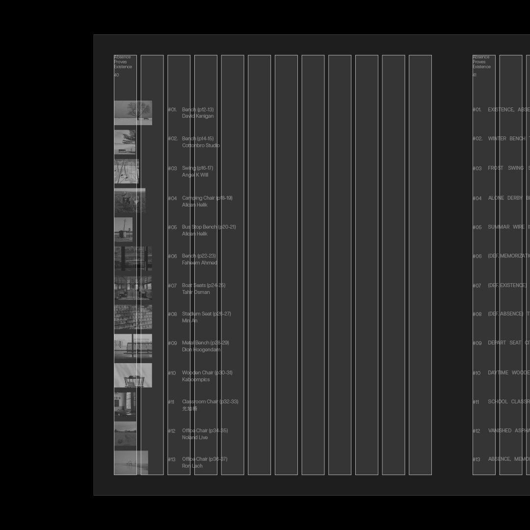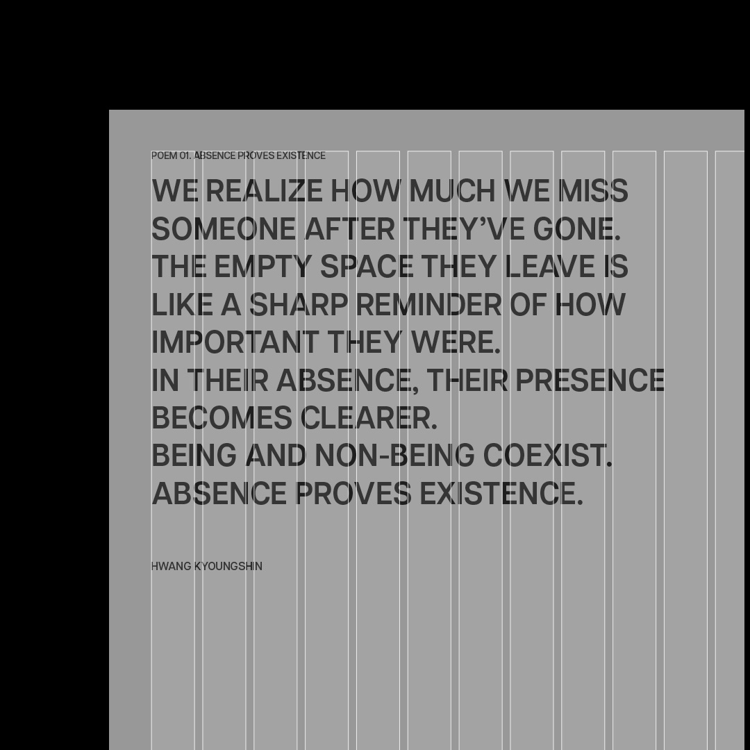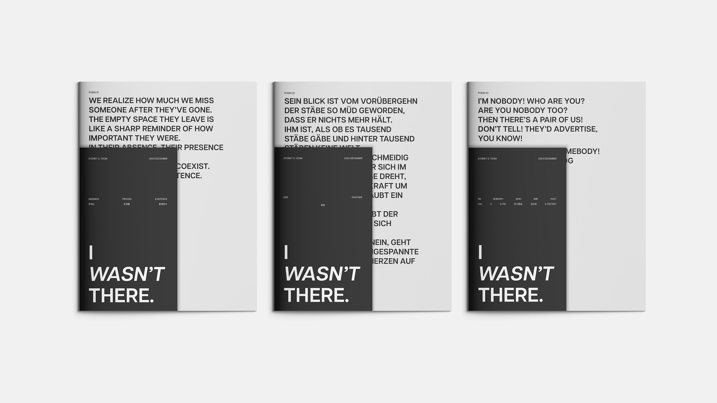 <I Wasn't There> is a booklet series that brings together three poems under a shared title. Using a strictly black-and-white color palette, the project visually and conceptually explores the relationship between absence and existence. Each poem is paired with monochromatic photography, where black and white imagery reinforces the tension between what is present and what is missing, allowing absence itself to become a form of presence.