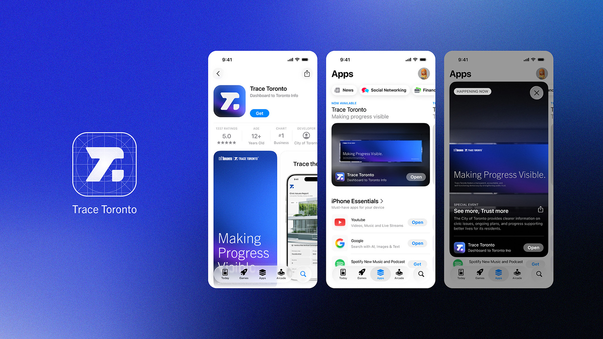 Trace Toronto is a civic dashboard designed to help residents stay informed about the city’s progress on public initiatives and infrastructure projects. By making government data more transparent and accessible, the platform aims to strengthen trust between the city and its residents while offering a clearer understanding of ongoing developments across Toronto.